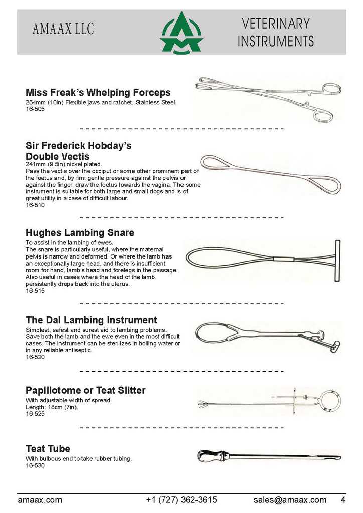 Miss Freak?s Whelping Forceps 254mm (10in) Flexible jaws and ratchet, Stainless Steel. 16-505 Sir Frederick Hobday?s Double Vectis 241mm (9.5in) nickel plated. Pass the vectis over the occiput or some other prominent part of the foetus and, by firm gentle pressure against the pelvis or against the finger, draw the foetus towards the vagina. The some instrument is suitable for both large and small dogs and is of great utility in a case of difficult labour. 16-510 Hughes Lambing Snare To assist in the lambing of ewes. The snare is particularly useful, where the maternal pelvis is narrow and deformed. Or where the lamb has an exceptionally large head, and there is insufficient room for hand, lamb?s head and forelegs in the passage. Also useful in cases where the head of the lamb, persistently drops back into the uterus. 16-515 The Dal Lambing Instrument Simplest, safest and surest aid to lambing problems. Save both the lamb and the ewe even in the most difficult cases. The instrument can be sterilizes in boiling water or in any reliable antiseptic. 16-520 Papillotome or Teat Slitter With adjustable width of spread. Length: 18cm (7in). 16-525 Teat Tube With bulbous end to take rubber tubing. 16-530