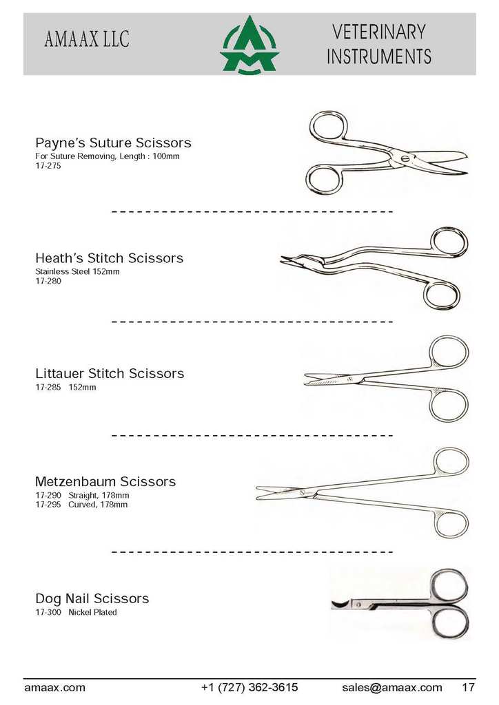 Payne?s Suture Scissors For Suture Removing, Length : 100mm 17-275 Heath?s Stitch Scissors Stainless Steel 152mm 17-280 Littauer Stitch Scissors 17-285 152mm Metzenbaum Scissors 17-290 Straight, 178mm 17-295 Curved, 178mm Dog Nail Scissors 17-300 Nickel Plated
