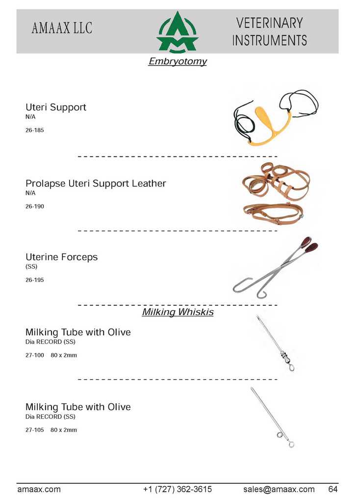 Embryotomy Uteri Support N/A 26-185 Prolapse Uteri Support Leather N/A 26-190 Uterine Forceps (SS) 26-195 Milking Whiskis Milking Tube with Olive Dia RECORD (SS) 27-100 80 x 2mm Milking Tube with Olive Dia RECORD (SS) 27-105 80 x 2mm