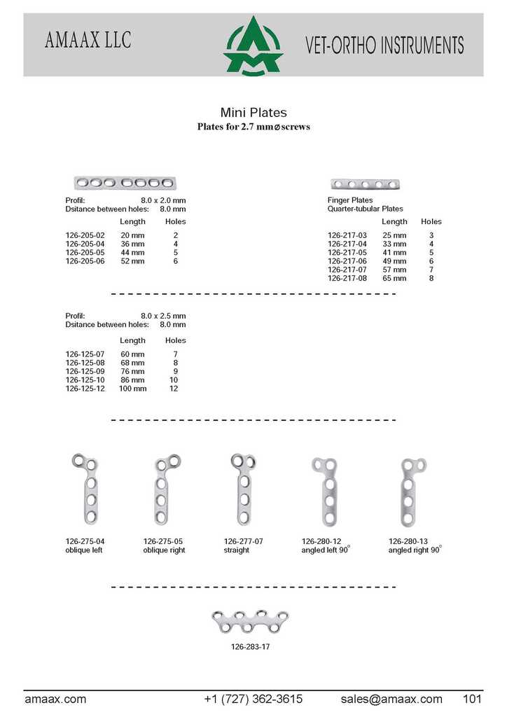 Mini Plates Plates for 2.7 mm screws Profil: 8.0 x 2.0 mm Finger Plates Dsitance between holes: 8.0 mm Quarter-tubular Plates Length Holes Length Holes 126-205-02 20mm 2 126-217-03 25mm 3 126-205-04 36mm 4 126-217-04 33mm 4 126-205-05 44mm 5 126-217-05 41mm 5 126-205-06 52mm 6 126-217-06 49mm 6 126-217-07 57mm 7 126-217-08 65mm 8 Profil: 8.0 x 2.5 mm Dsitance between holes: 8.0 mm Length Holes 126-125-07 60mm 7 126-125-08 68mm 8 126-125-09 76mm 9 126-125-10 86mm 10 126-125-12 100 mm 12 126-275-04 126-275-05 126-277-07 126-280-12 126-280-13 oblique left oblique right straight angled left 90 angled right 90 126-283-17